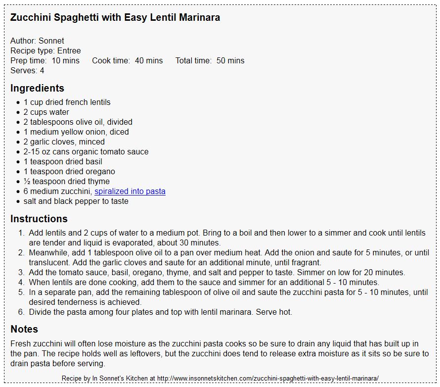 April 11, 2014 by Renee Marie Fox Leave a comment Recipe | Zucchini Spaghetti with Easy Lentil Marinara Zucchini Spaghetti with Easy Lentil Marinara – In Sonnet’s Kitchen. Share this:TweetLike Loading...